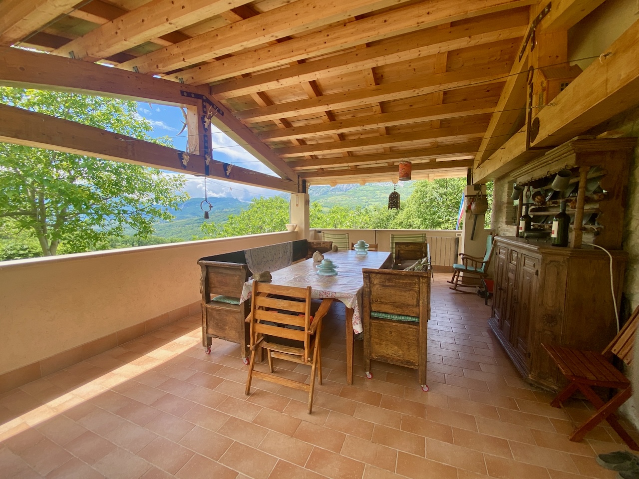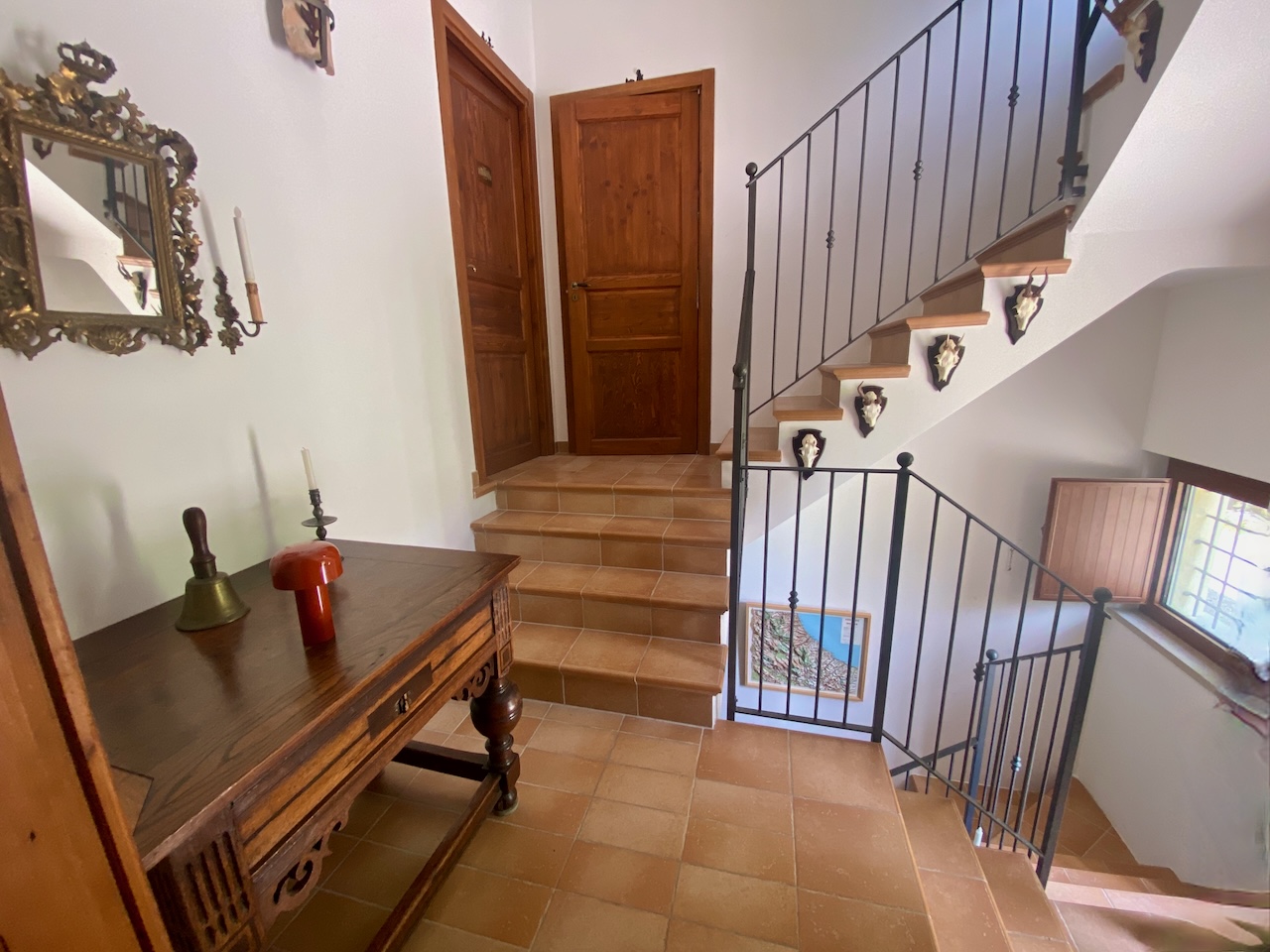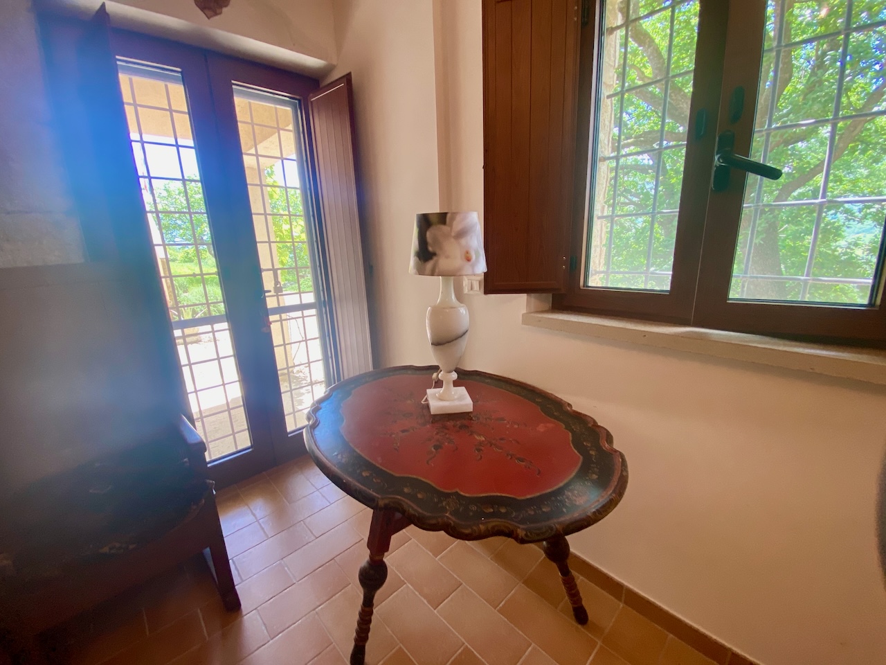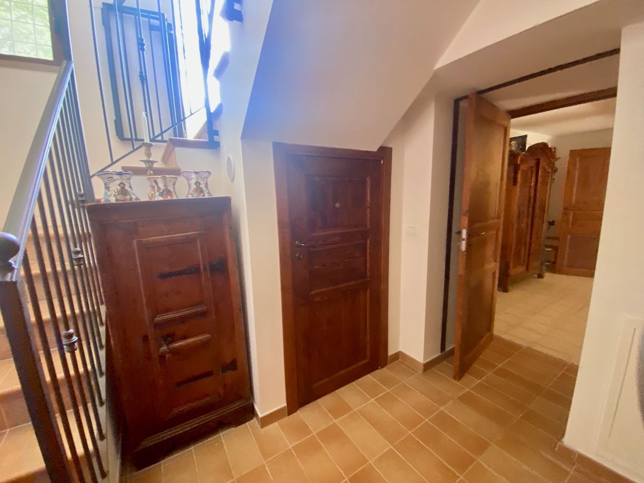 Veranda con splendida vista, accogliente salotto con camino e mobili antichi, cucina accogliente con lungo tavolo e terrazzino sul davanti, passaggio al vano delle scale e all'ingresso. |