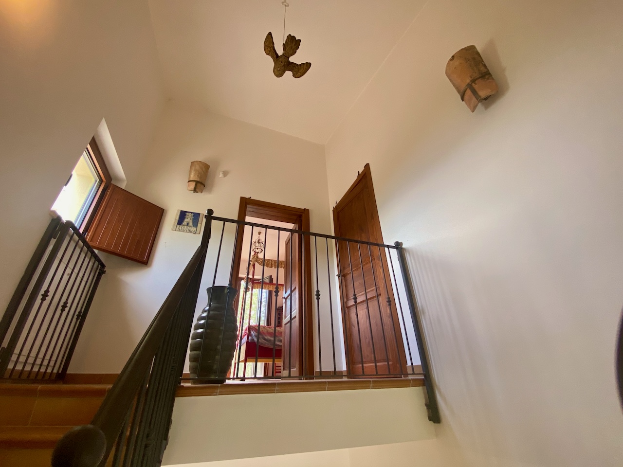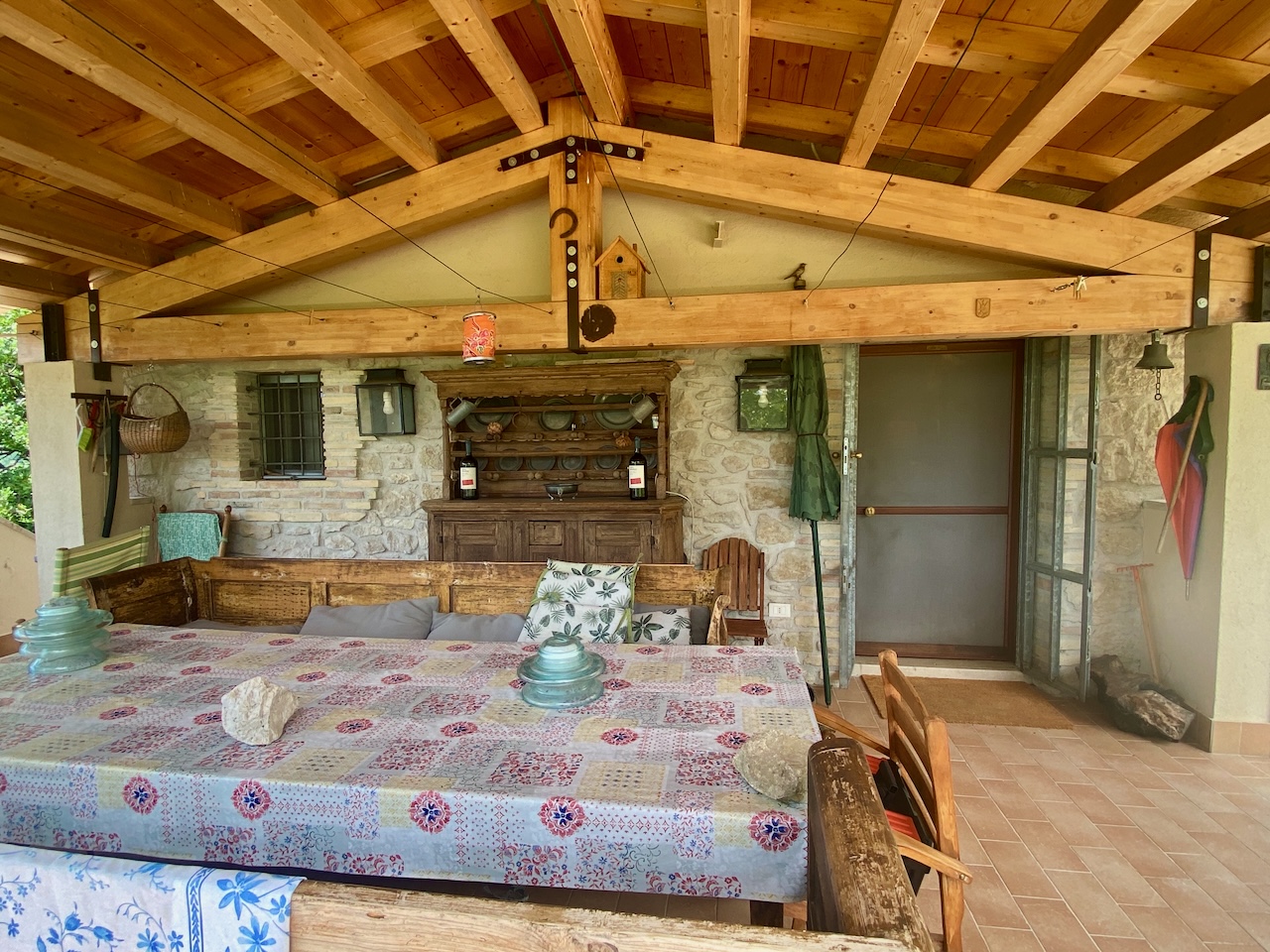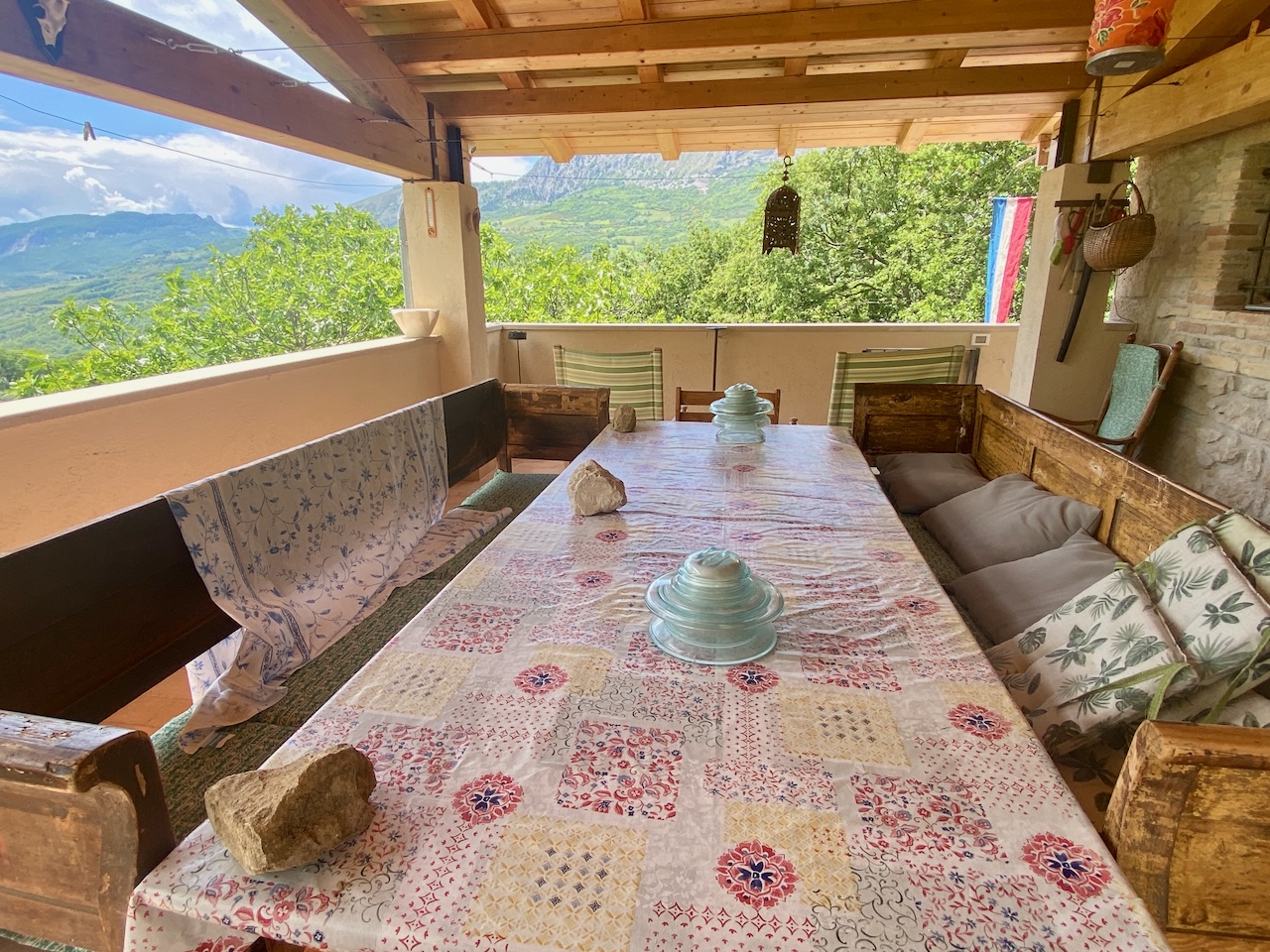 Veranda con splendida vista, accogliente salotto con camino e mobili antichi, cucina accogliente con lungo tavolo e terrazzino sul davanti, passaggio al vano delle scale e all'ingresso. |