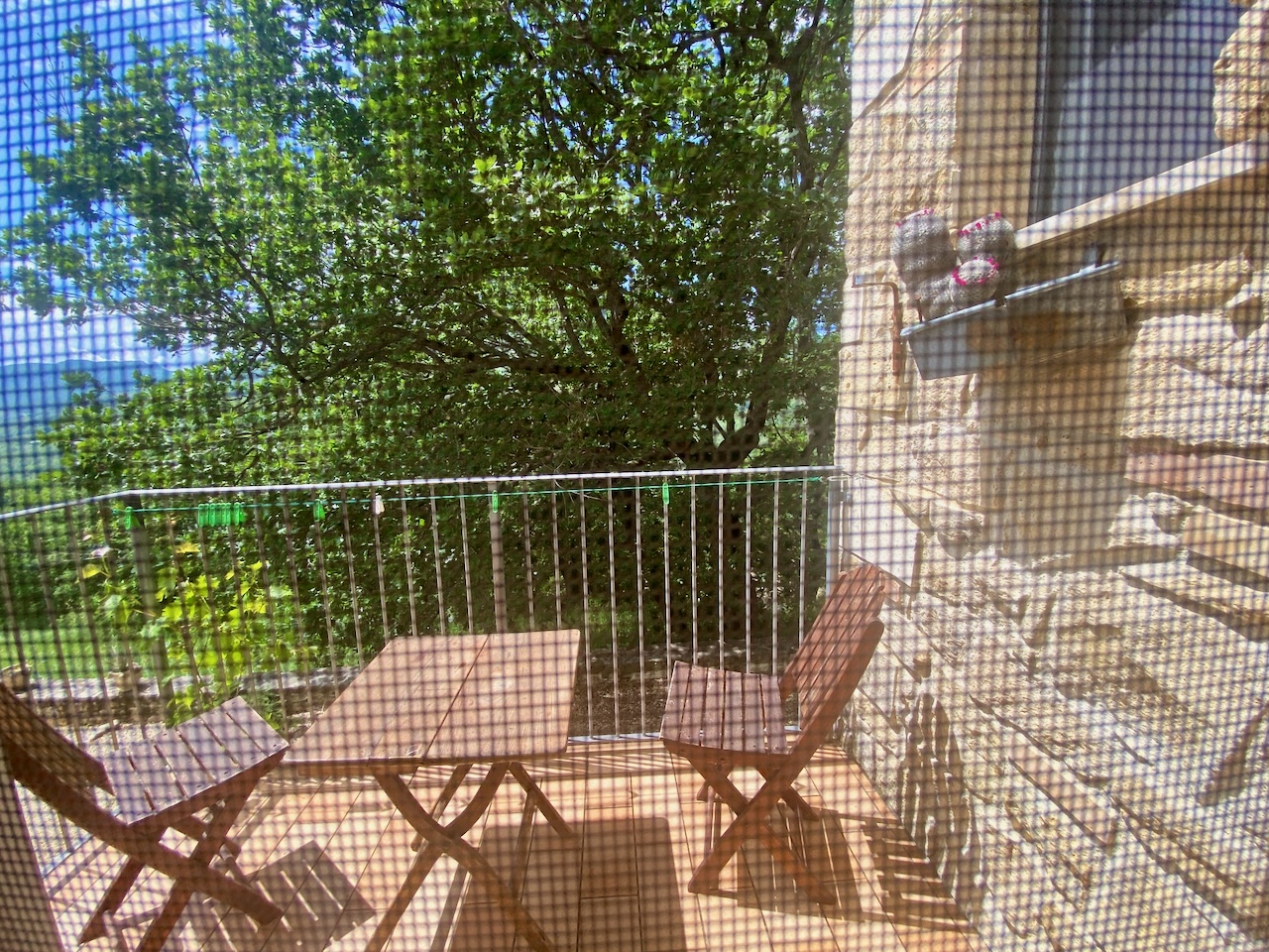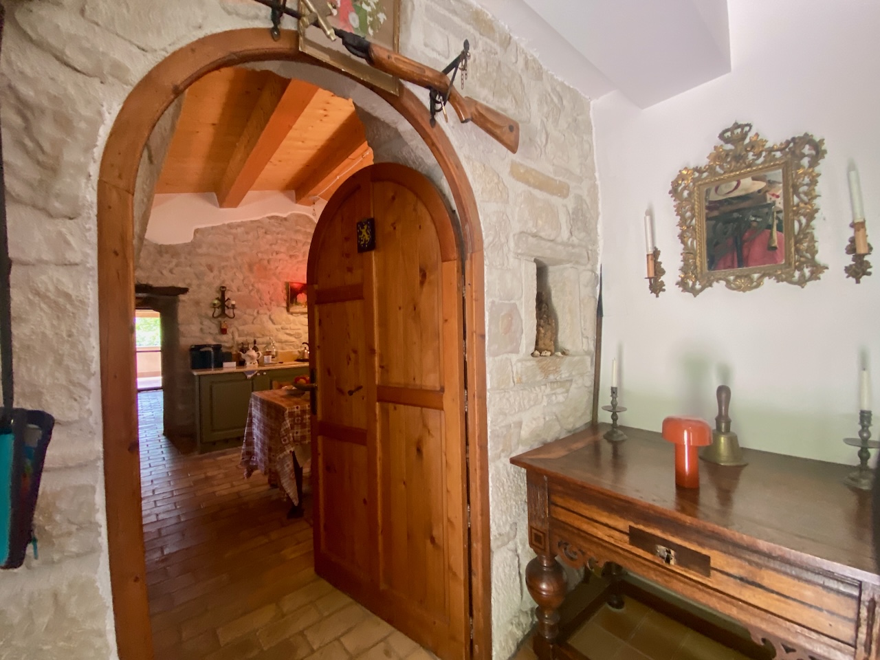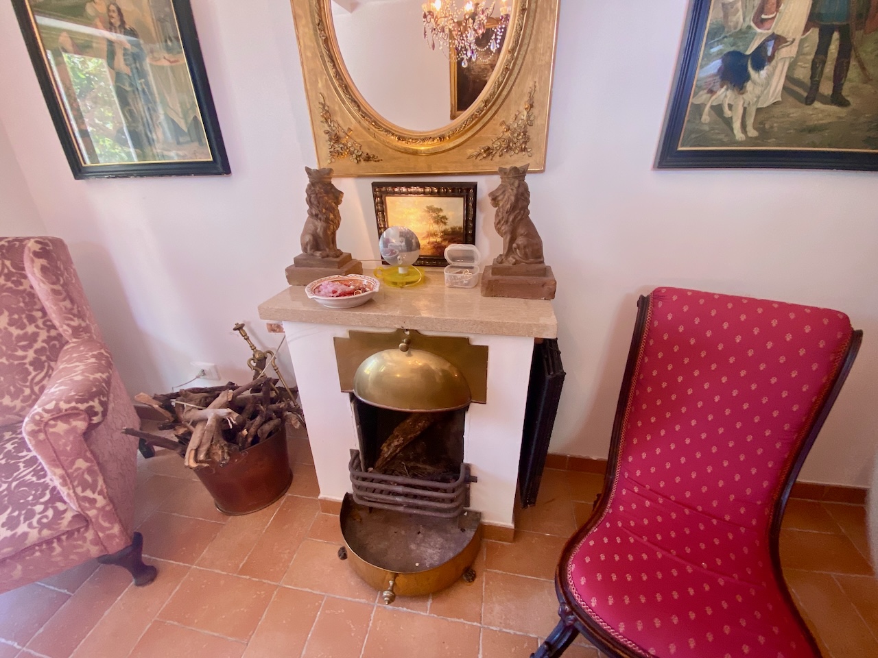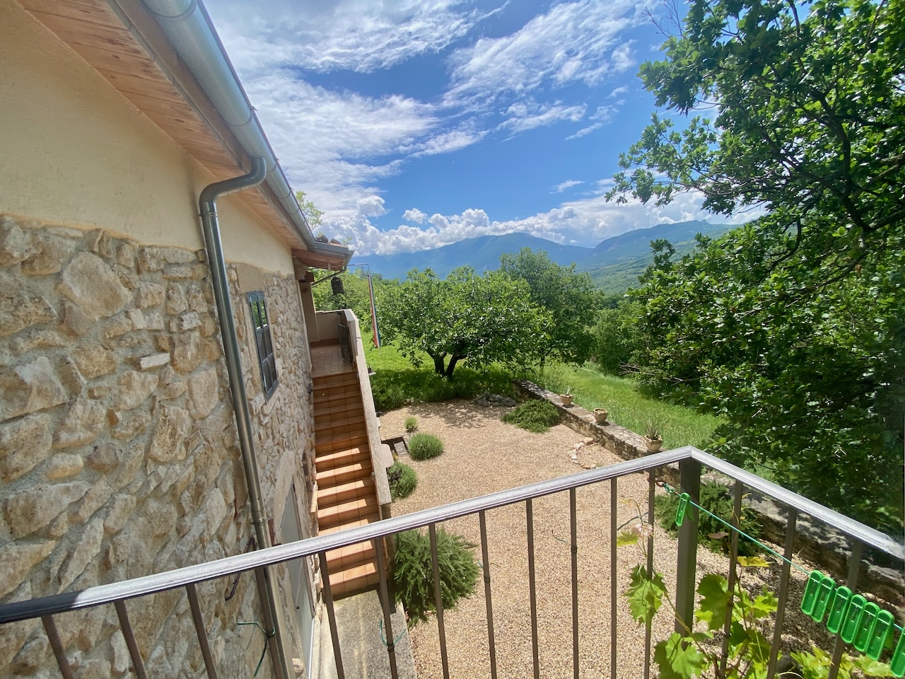 Veranda con splendida vista, accogliente salotto con camino e mobili antichi, cucina accogliente con lungo tavolo e terrazzino sul davanti, passaggio al vano delle scale e all'ingresso. |