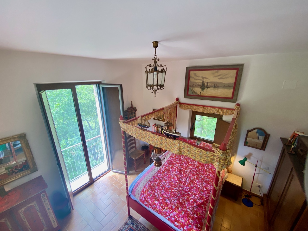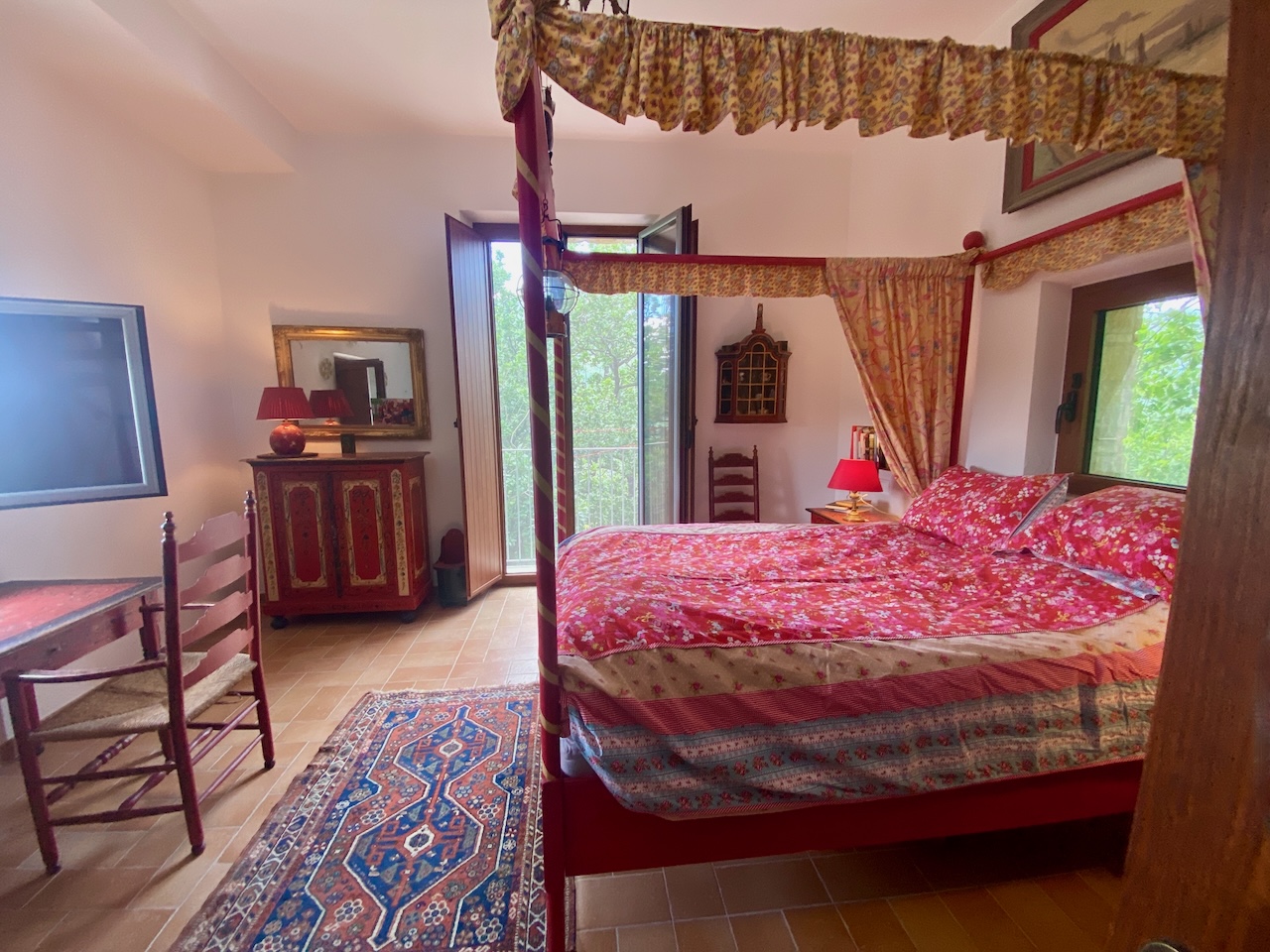 Camera da letto con balcone e splendidi mobili in stile Hindeloopen, un letto a baldacchino e scale a chiocciola che conducono alla terrazza sul tetto della torre da cui si può godere della vista più incantevole sulle valli, i paesi e le montagne dell'Abruzzo! Bagno. |