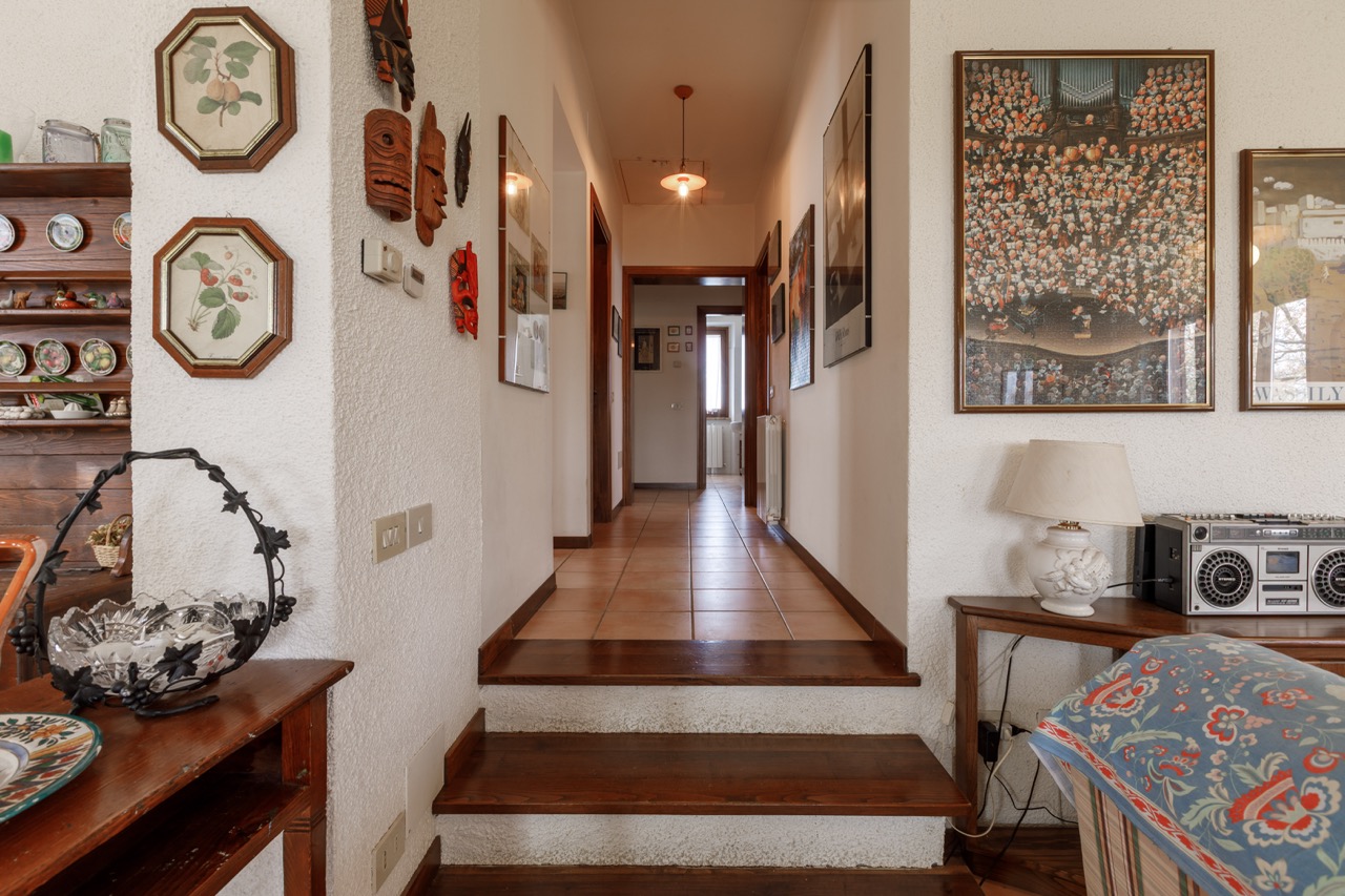 L’immobile si sviluppa su tre livelli. Al piano seminterrato si trova una cantina molto ampia, che ospita l’impianto tecnico della casa e offre ampi spazi per il rimessaggio. Sullo stesso livello si trova anche un’ampia autorimessa, in grado di accogliere più veicoli. La proprietà dispone di un accesso privato e di un grande giardino con orto, pratco, alberi maturi e molta privacy.