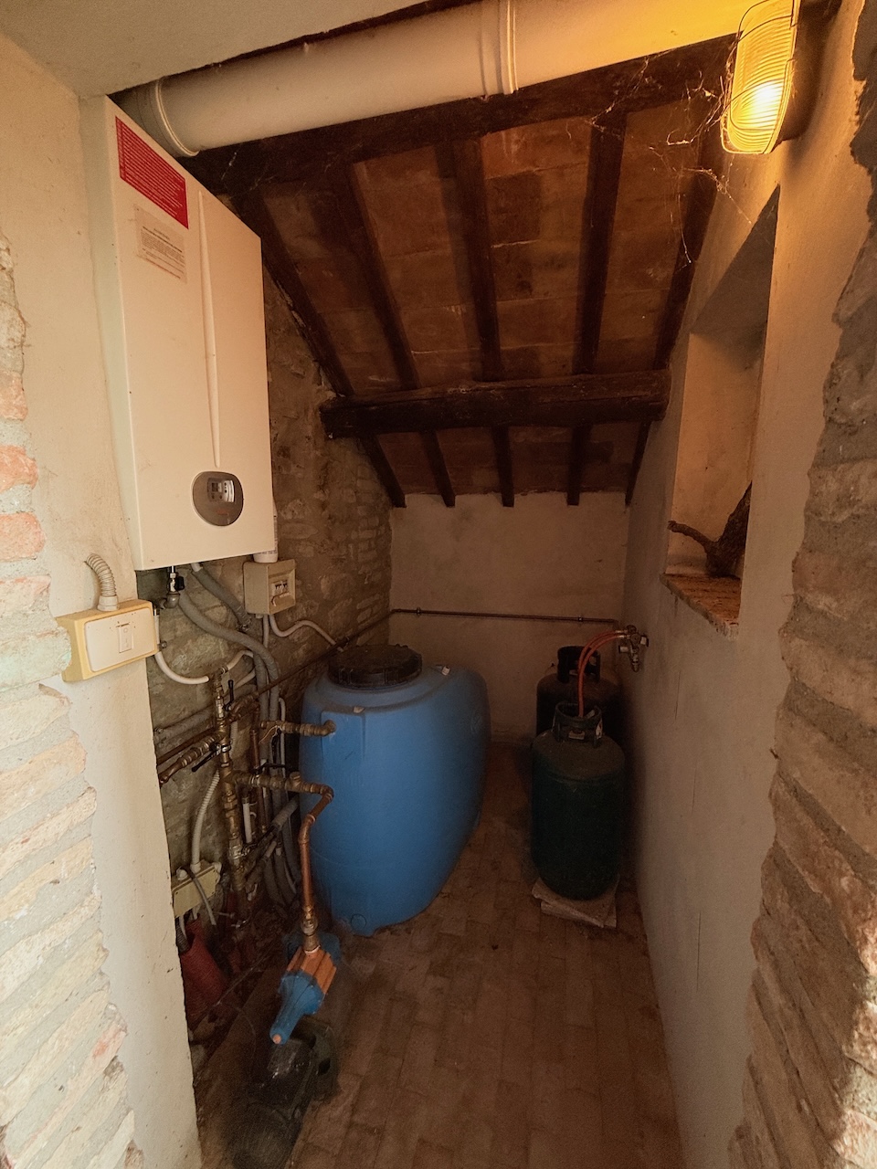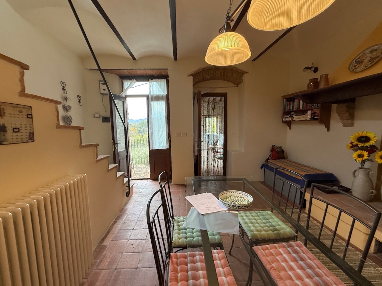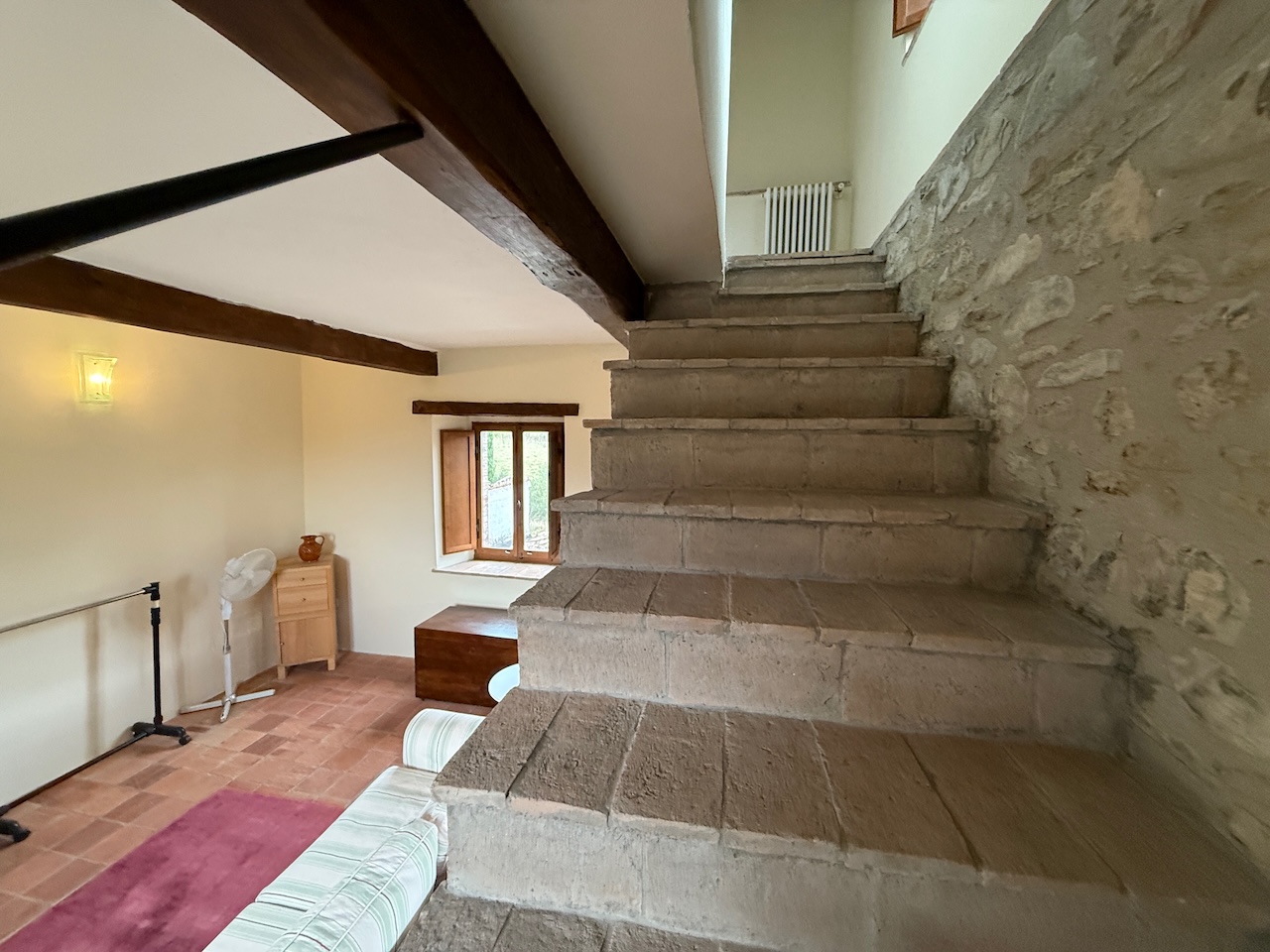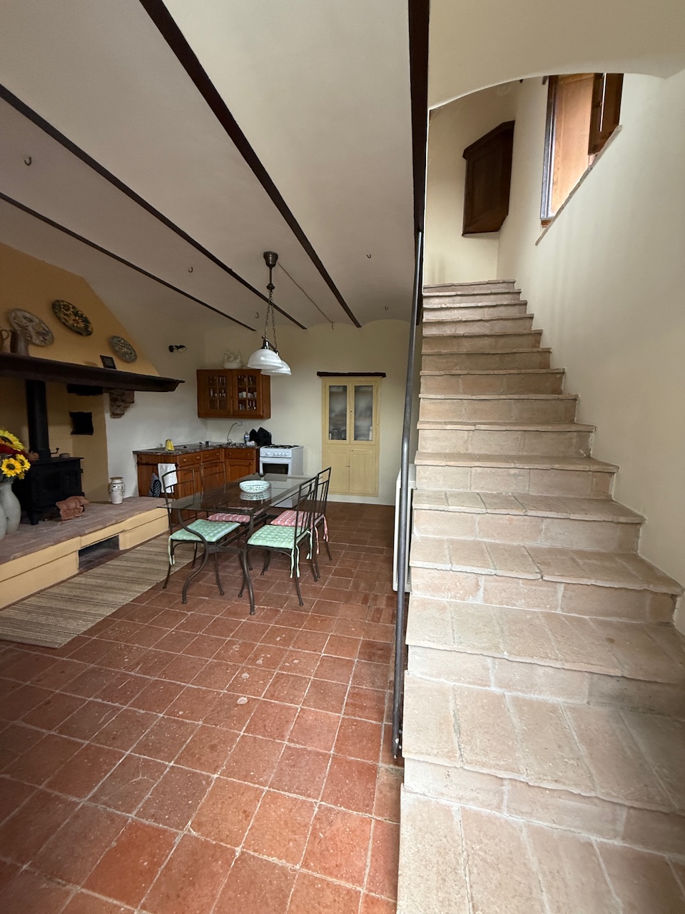 All’interno sono stati mantenuti le travi originali, le nicchie e i pavimenti in cotto, mentre gli impianti tecnici sono stati completamente rinnovati. La casa è dotata di termosifoni per il riscaldamento e di due camini – uno al primo e uno al secondo piano – che garantiscono un’atmosfera calda e accogliente anche in inverno.