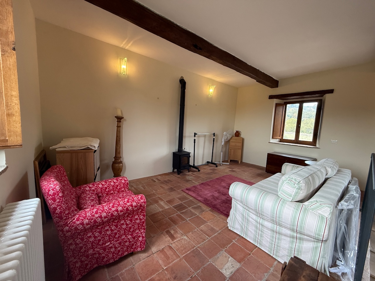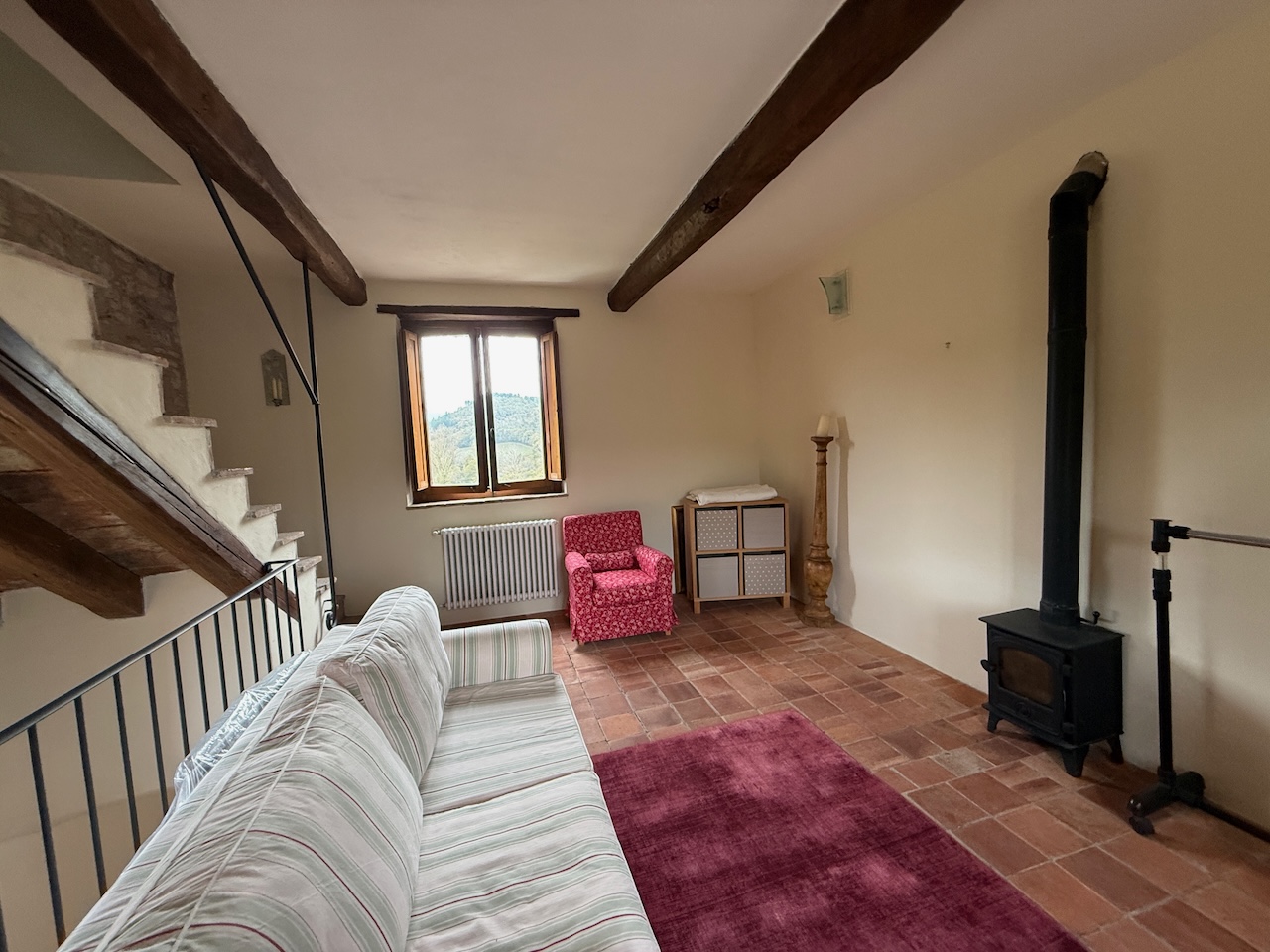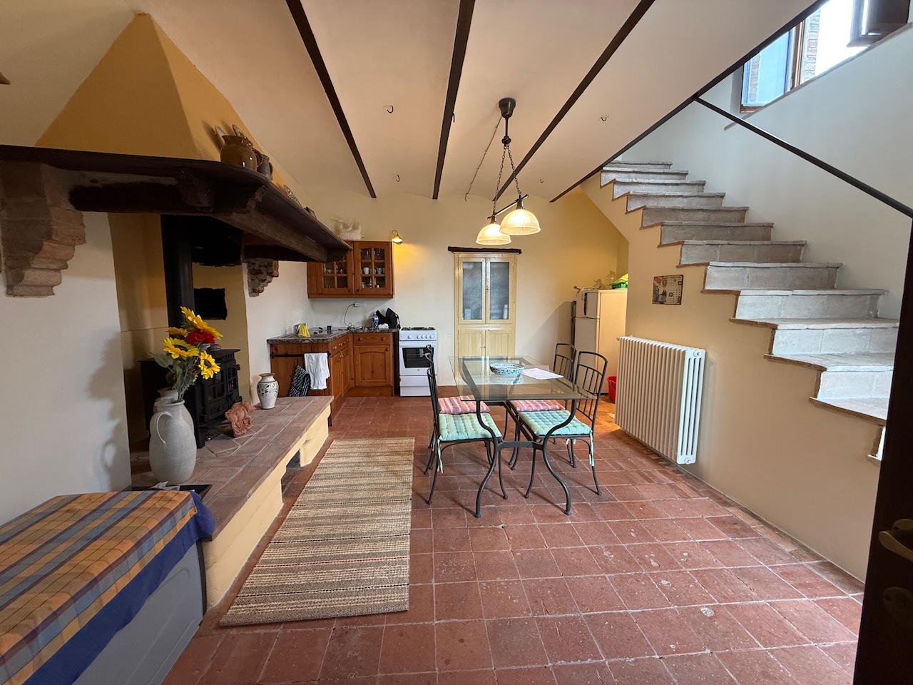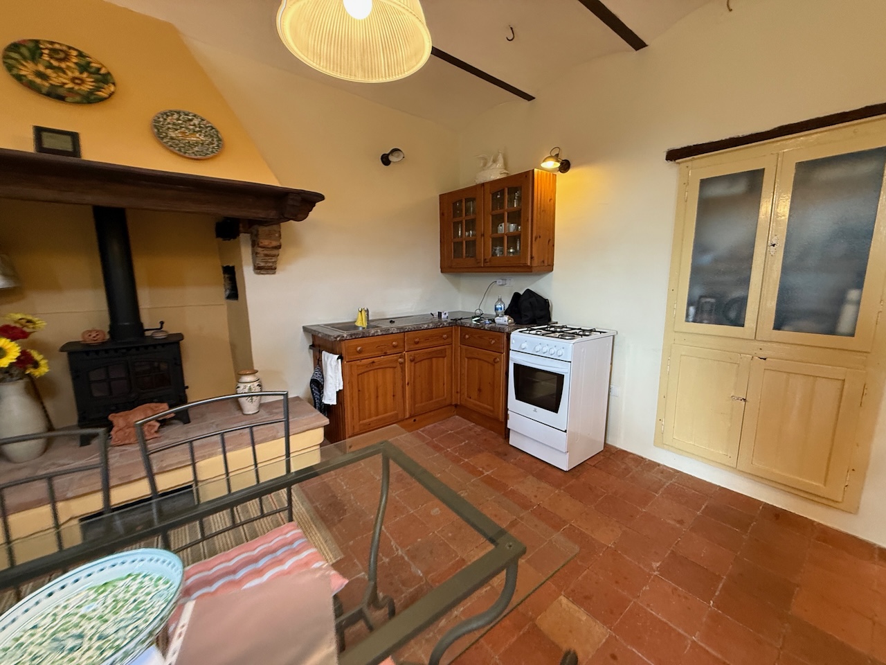 All’interno sono stati mantenuti le travi originali, le nicchie e i pavimenti in cotto, mentre gli impianti tecnici sono stati completamente rinnovati. La casa è dotata di termosifoni per il riscaldamento e di due camini – uno al primo e uno al secondo piano – che garantiscono un’atmosfera calda e accogliente anche in inverno.