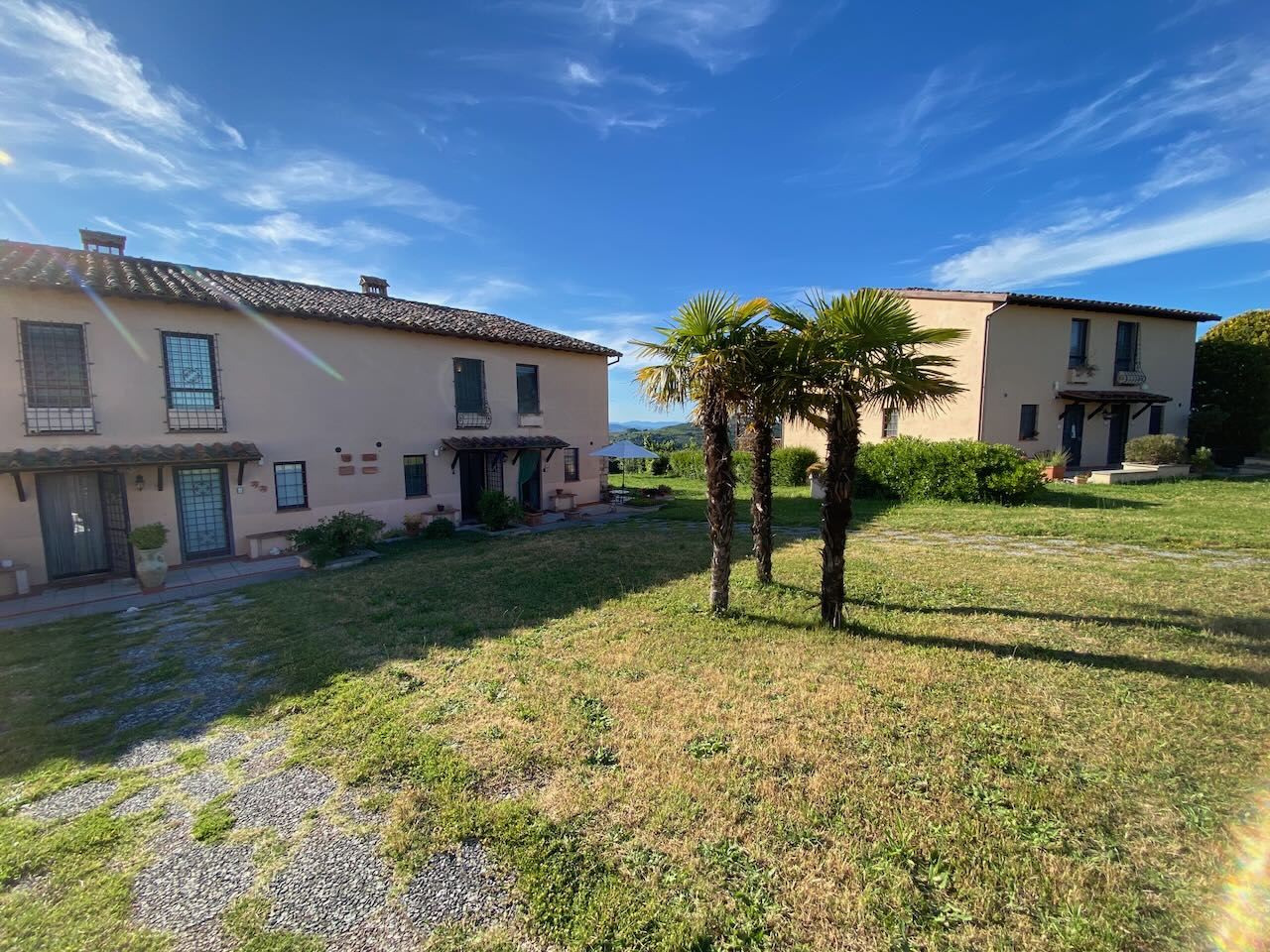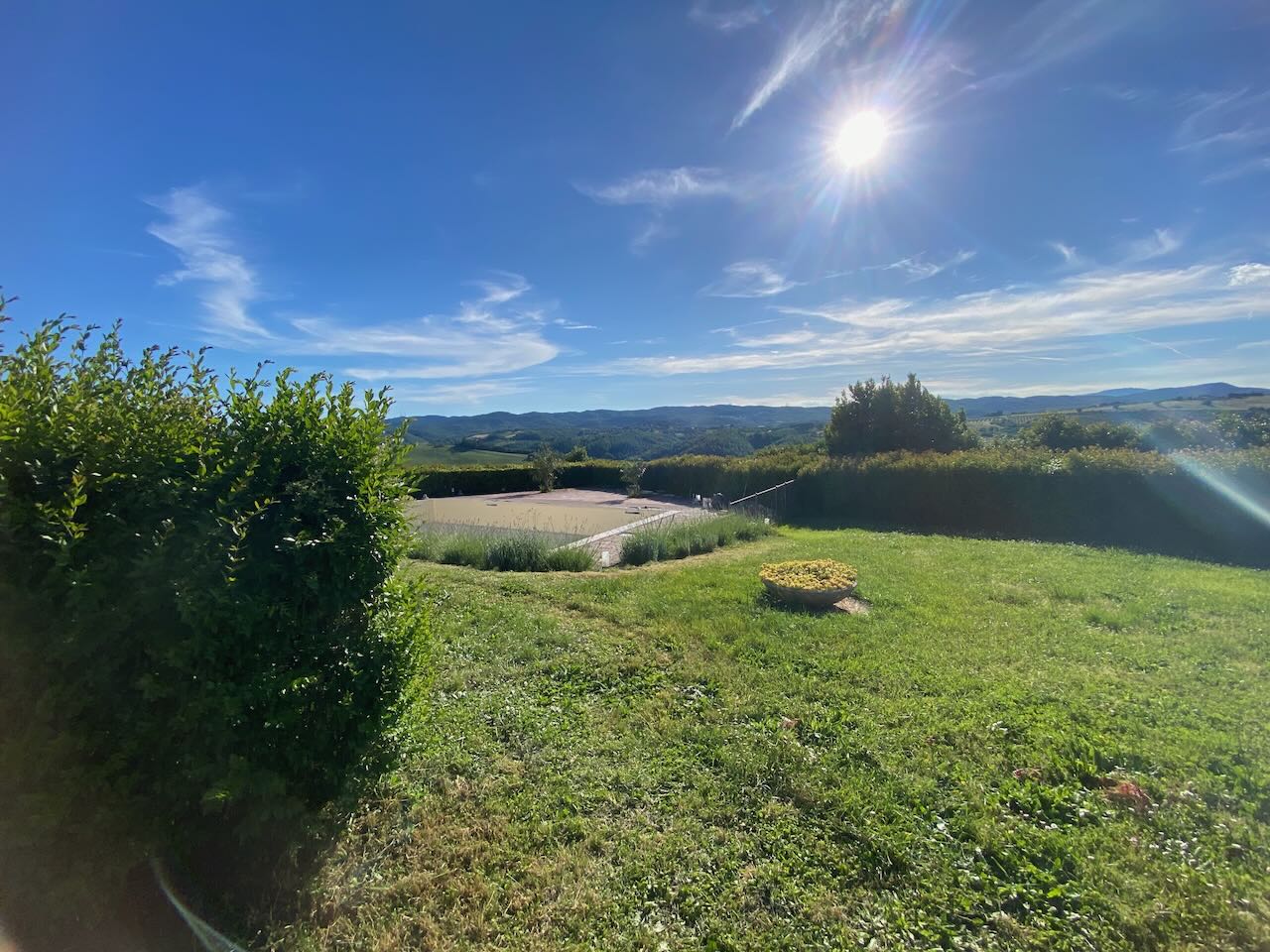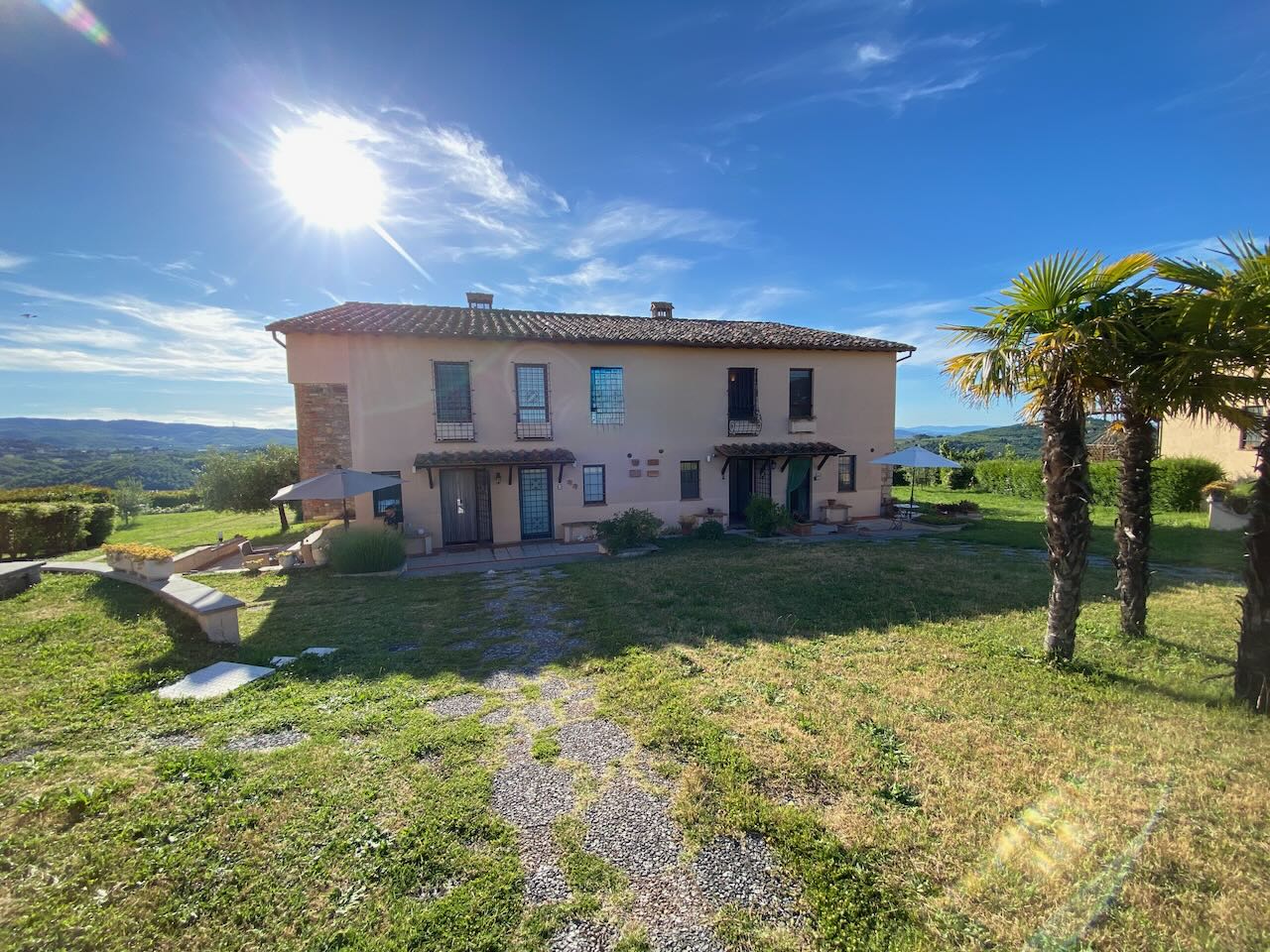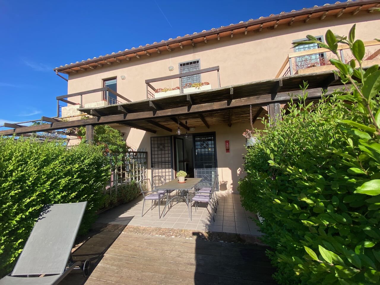 Questa abitazione fa parte di un piccolo residence di 8 (divise in 3 fabbricati separati) costruito nel 1992 in cima ad una collina con un panorama spettacolare a 360°! Il condominio dispone di un parcheggio, una bella piscina con solarium, dei prati e giardini. L'abitazione ha anche un garage privato. La casa (120 mq) a schiera al piano terra si compone di: ingresso, corridoio, cucina, rispostiglio/studio/cameretta, bagno, soggiorno con camino e terrazza con portico panoramico; ed al piano primo di: 2 camere da letto (1 con balcone), 2 bagni (di cui 1 con vasca). Perfetta per le vacanze e/o lunghi soggiorni! |