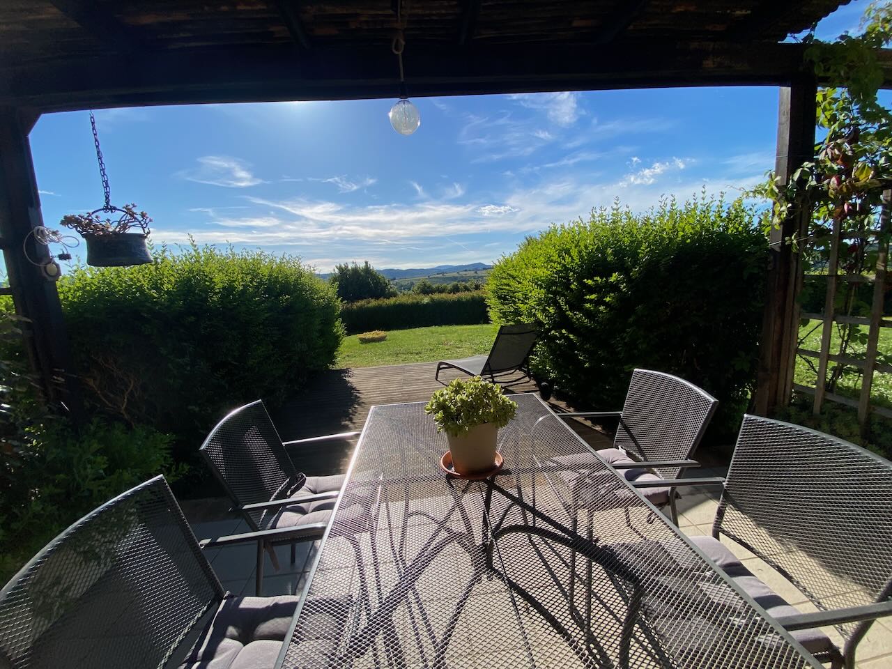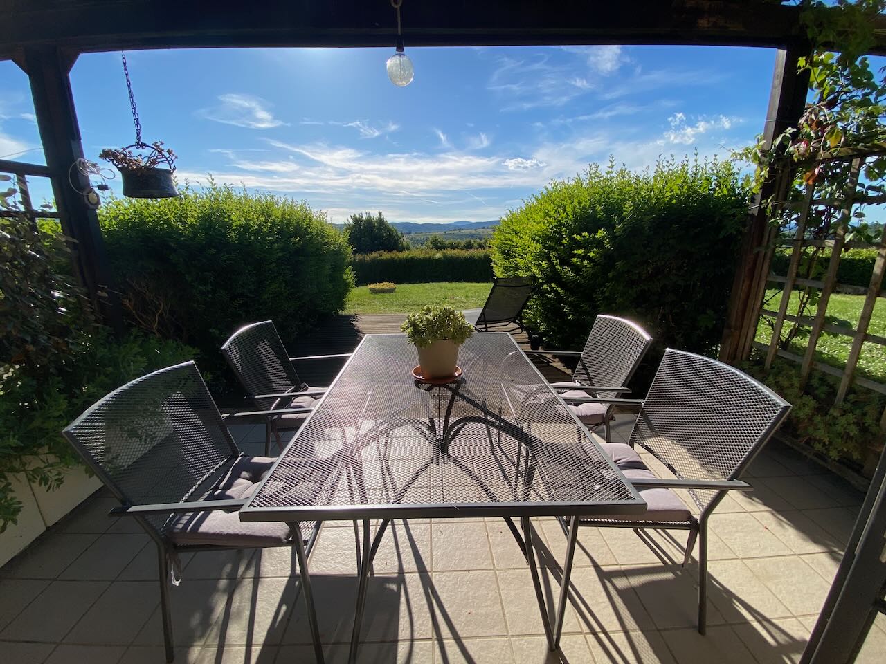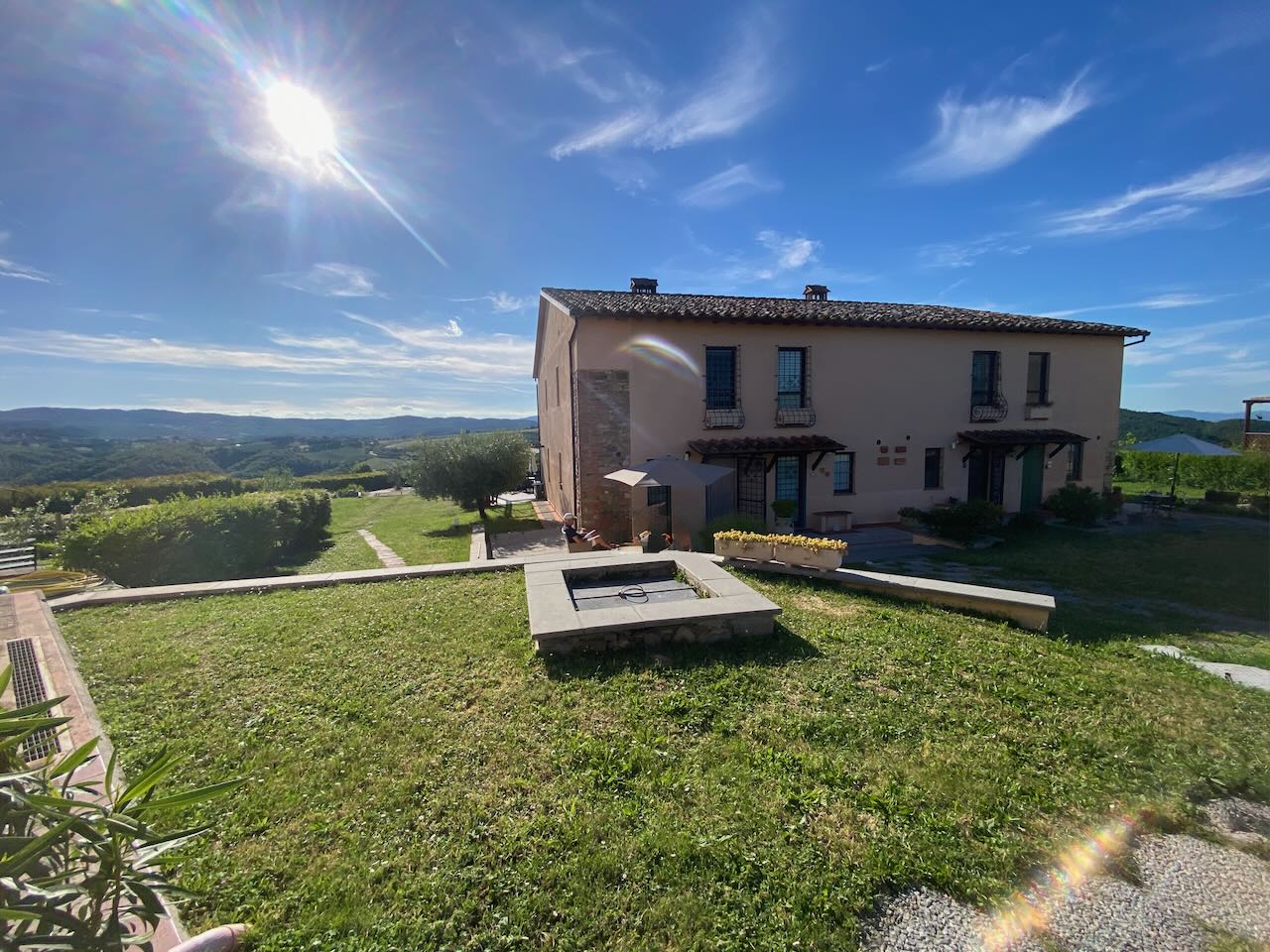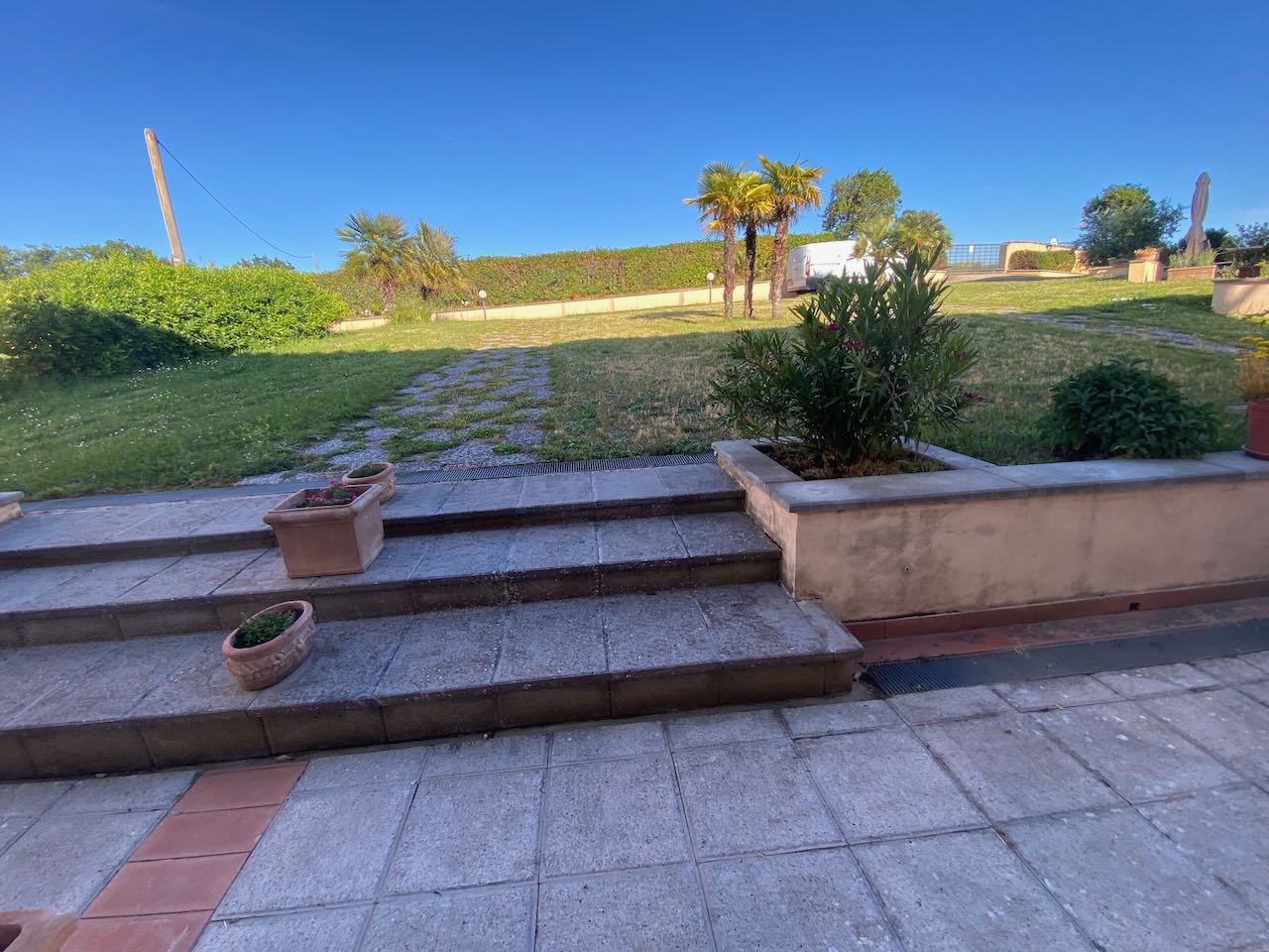 Questa abitazione fa parte di un piccolo residence di 8 (divise in 3 fabbricati separati) costruito nel 1992 in cima ad una collina con un panorama spettacolare a 360°! Il condominio dispone di un parcheggio, una bella piscina con solarium, dei prati e giardini. L'abitazione ha anche un garage privato. La casa (120 mq) a schiera al piano terra si compone di: ingresso, corridoio, cucina, rispostiglio/studio/cameretta, bagno, soggiorno con camino e terrazza con portico panoramico; ed al piano primo di: 2 camere da letto (1 con balcone), 2 bagni (di cui 1 con vasca). Perfetta per le vacanze e/o lunghi soggiorni! |
