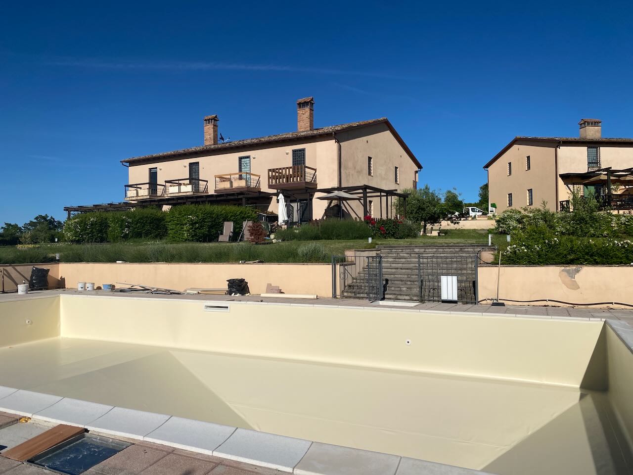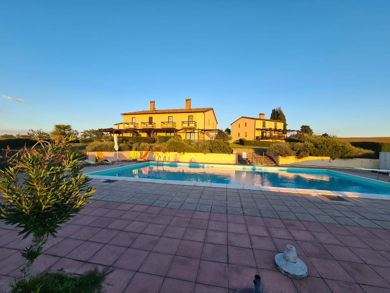 Piscina condominiale con ampio solario intorno. |