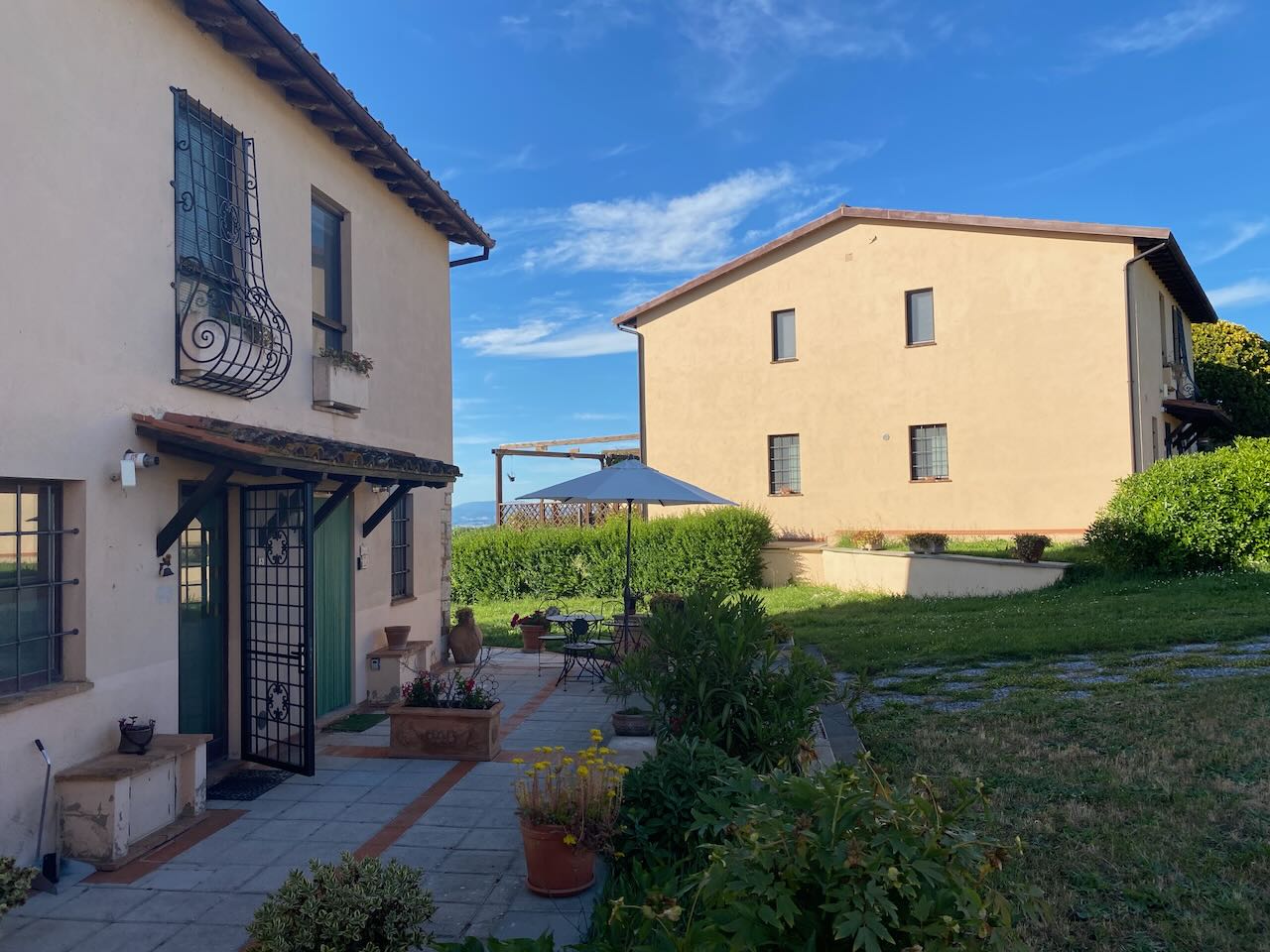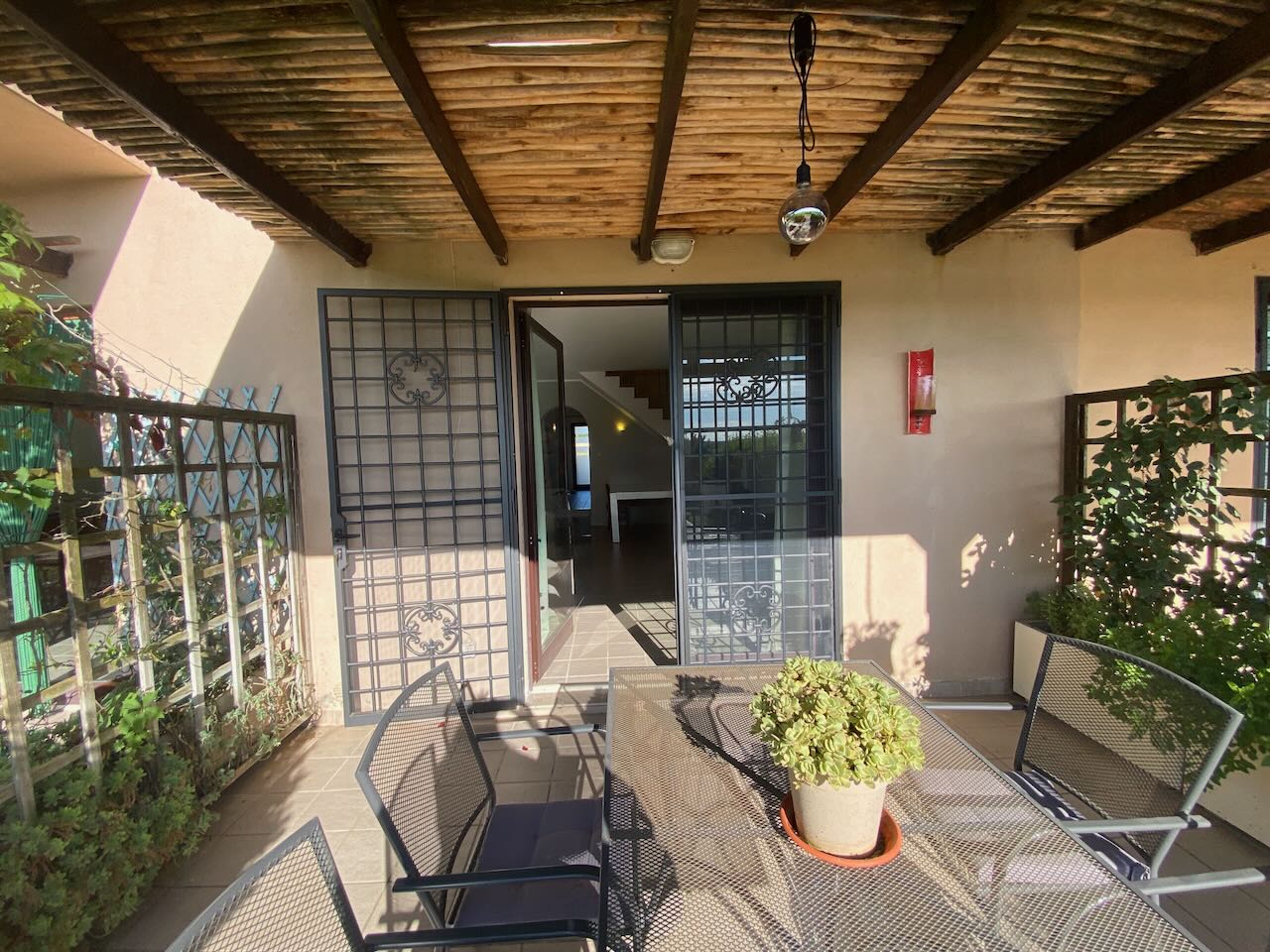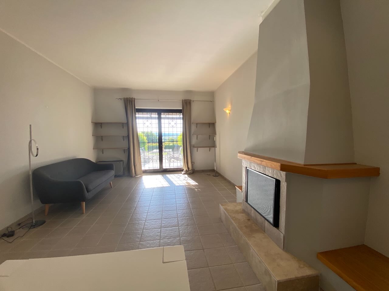 Ingresso, cucina, ripostiglio/studio/cameretta, bagno, soggiorno con camino e porte finestra verso giardino/terrazza/pergolato |